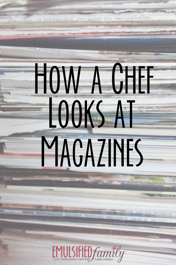When my chef/husband looks at magazines, he rips out pages that he likes and keeps them to refer to at a later time. It could be a recipe he could use as an idea, some sort of food presentation, seasonal decorations for brunch, etc. Whatever the case may be, if he likes something on the page, he tears it out and keeps it.